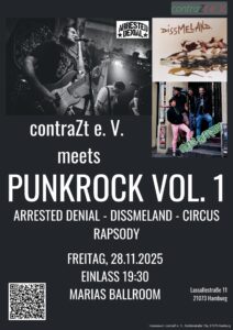 Ein Abend für alle, die Punk nicht nur hören, sondern leben. Arrested Denial bringen ihre Mischung aus melodischem Streetpunk und klarer politischer Haltung auf die Bühne – ehrlich, direkt und mit viel Herz. Dazu gesellen sich die genreübergreifenden Eskapaden von Circus Rhapsody, die irgendwo zwischen Zirkus, Wahnsinn und Rock’n’Roll ihr Zuhause gefunden haben, und Dissmeland, die mit ihrem Sound zwischen Melancholie und Wut genau den Nerv der Zeit treffen.